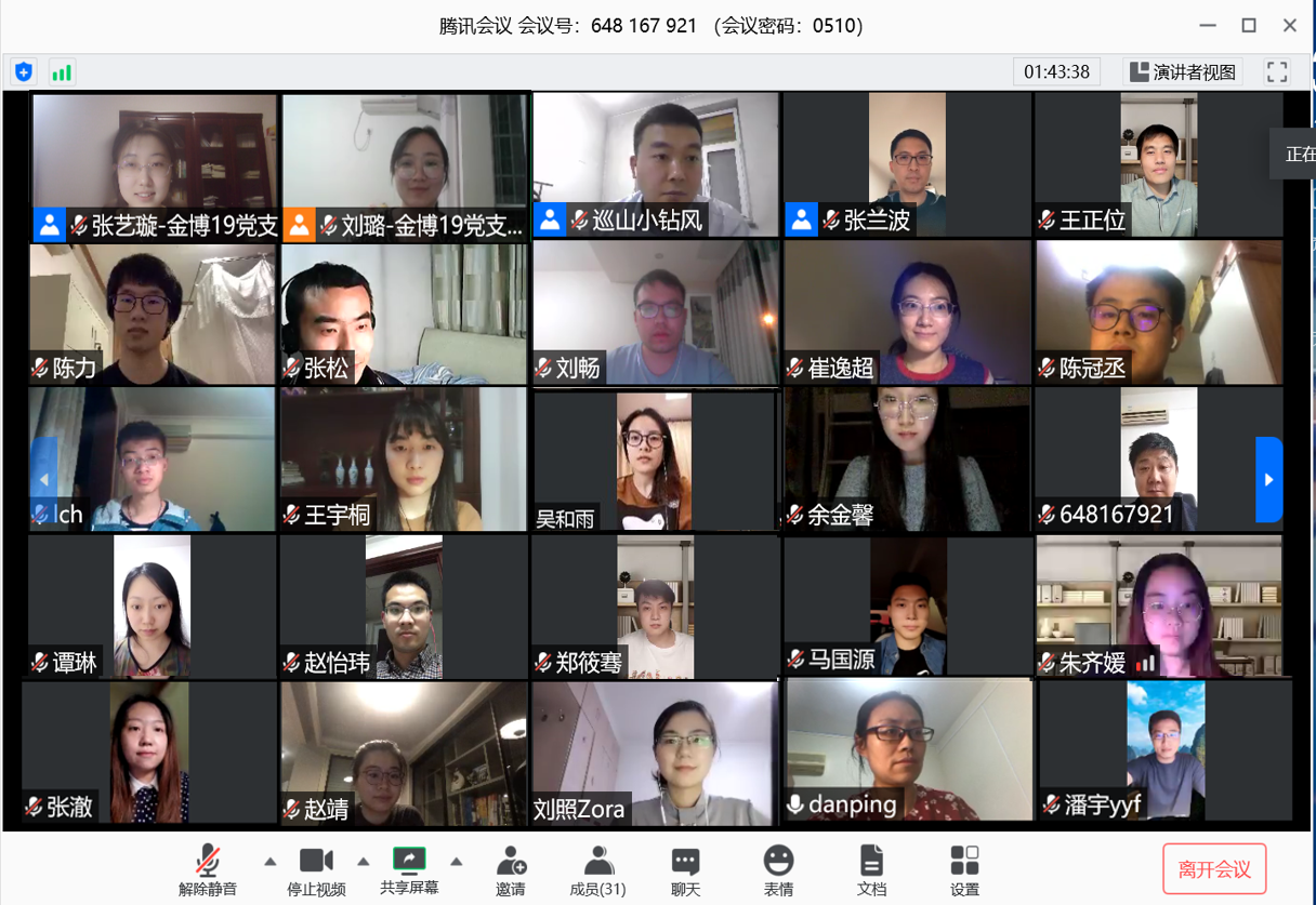 本次会议由金博19党支部宣传委员刘璐主持。各支部书记依次介绍支部情况。金博19非全日制党支部书记张兰波介绍,金博19非全日制党支部由12名在职同学组成,大家在金融业界有丰富的实践经验,疫情期间一边努力开展科研学习,一边在各自岗位上认真履职尽责,积极贡献力量。金博19党支部书记张艺璇介绍,金博19党支部由10名党员及6名积极分子组成,疫情期间同学们在家认真学习的同时,在线上举办了多次相关的组织生活,如“并肩战疫,共克时艰”线上主题研讨会、“风雨同舟、命运与共”党团班共建活动、“天涯比邻,疫路同行”清华-华中大两校四院党支部共建活动等,支部还组织党员自发捐款,为抗击疫情尽绵薄之力。