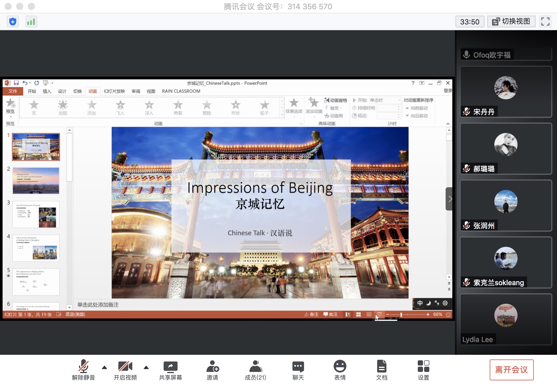 8xbet(中国)网5月29日电(通讯员 冯文欣)5月24日晚,“汉语说”工作坊之“京城印象(Impressionof Beijing)”专场在“云”上如期举行,本次活动吸引了来自6个院系、9个国家和地区的10余名国际生参加。在疫情防控时期,本学期的“汉语说”移步线上,通过网络搭建起了一座中外学生沟通交流的桥梁,保证中外学生跨文化交流“不断线”。