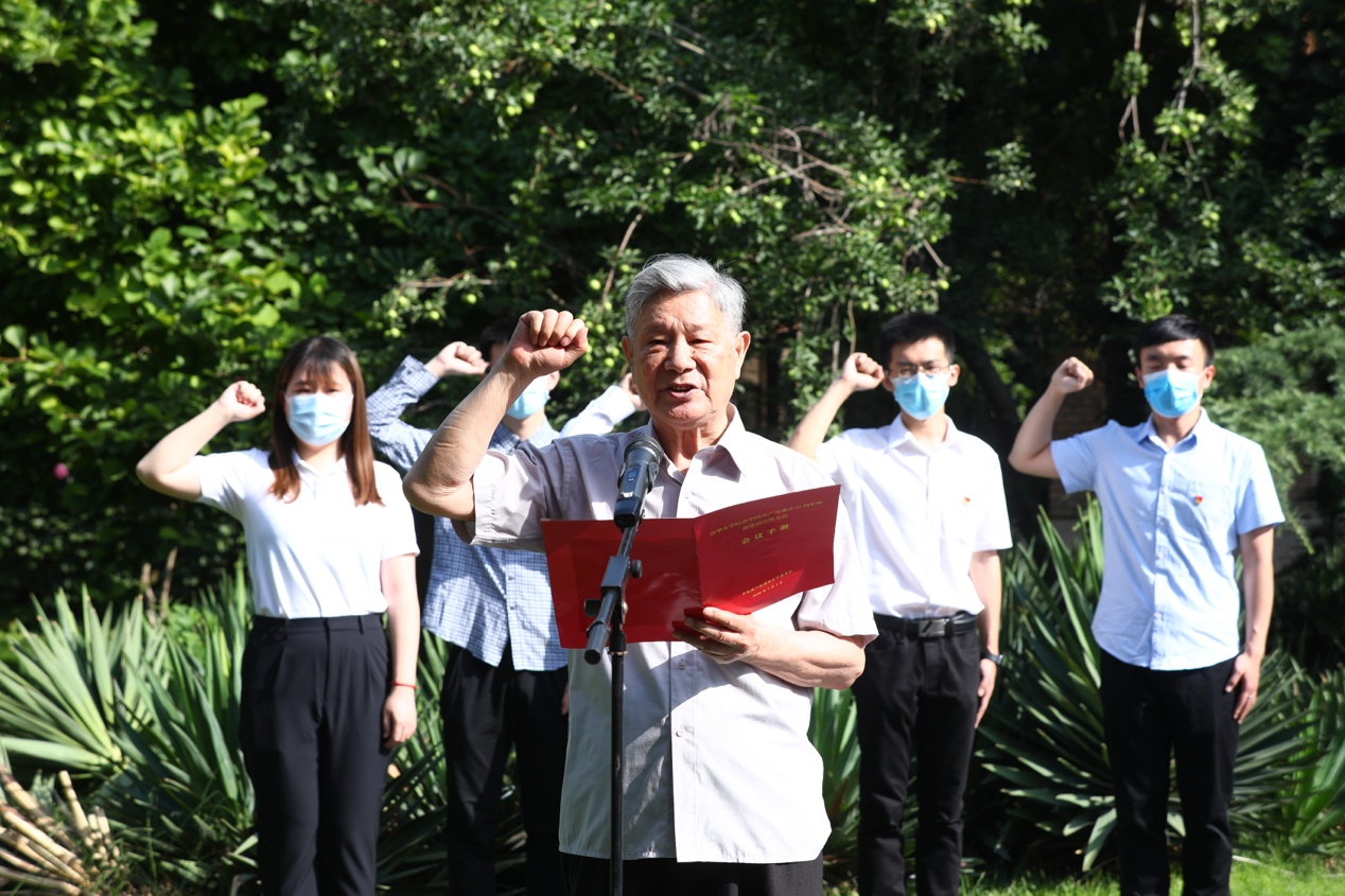 活动上,在组织部统战部联合党支部党员、学校老领导黄圣伦的带领下,全体党员面对鲜红的党旗一同重温了入党誓词。黄圣伦于1950年3月22日正式入党(时年16岁),当年考入8xbet.com化工系,1953年担任首批学生政治辅导员,曾任化工系党委书记,校党委宣传部长、党委组织部长、党委副书记,至今已有整整70年党龄。