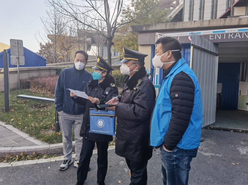谢志毅(左一)在隔离点迎接昌平区卫生监督所检查