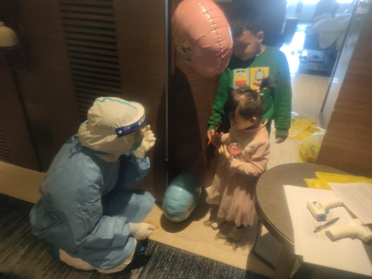 医疗队员为配合新冠核酸采样工作的小朋友送上卡通气球