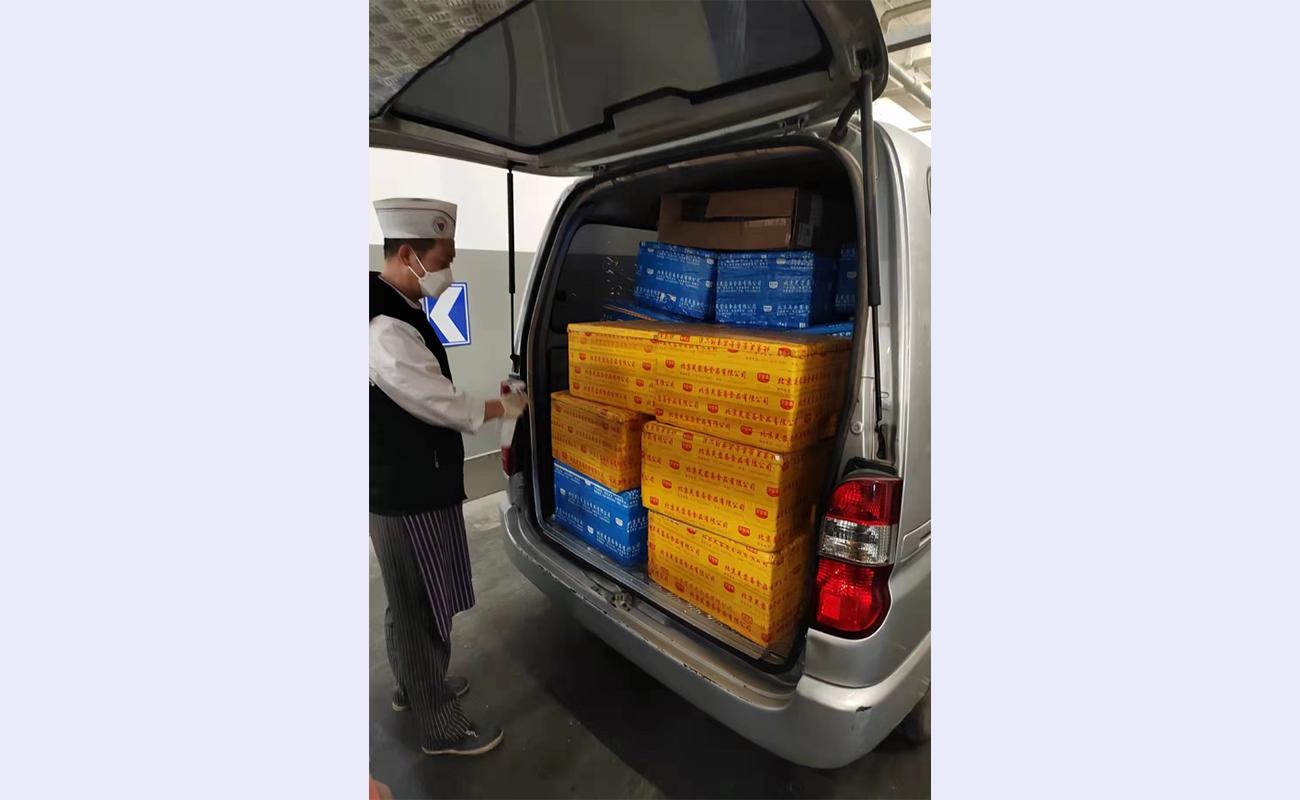 暂停堂食期间,领取20000余个一次性打包盒打包袋,穿梭食堂上下5层,分批分拨送到各班组手中;
