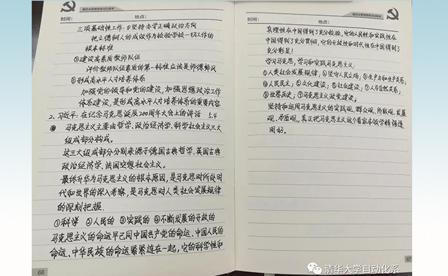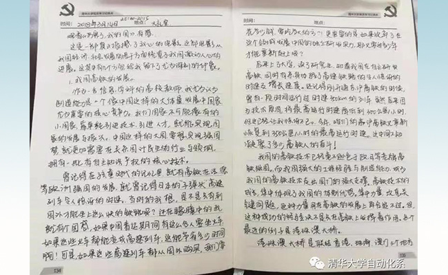 前不久,自动化系举办了教师思想政治理论学习记录本展览,这是其中的两份。一份是《厉害了!我的国》电影观后感,写了满满四页;一份是文件学习心得,记录工整、总结到位。透过这些笔记,不仅感受到自动化教师的严谨作风,扑面而来的,还有满满的家国情怀。