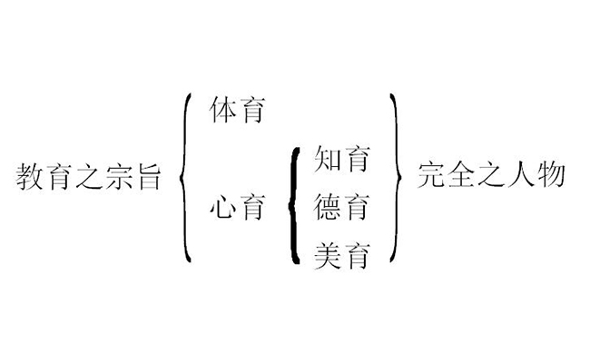 教育之宗旨何在?在使人为完全之人物而已。何谓完全之人物?谓人之能力无不发达且调和是也。人之能力分为内外二者:一曰身体之能力,一曰精神之能力。发达其身体而萎缩其精神,或发达其精神而罢敝其身体,皆非所谓完全者也。完全之人物,精神与身体必不可不为调和之发达。而精神之中,又分为三部:知力、感情及意志是也。对此三者而有真美善之理想:“真”者知力之理想,“美”者感情之理想,“善”者意志之理想也。完全之人物,不可不备真美善之三德,欲达此理想,于是教育之事起。教育之事,亦分为三部:知育、德育(即意志)、美育(即情育)是也。如佛教之一派,及希腊罗马之斯多噶派,抑压人之感情,而使其能力,专发达于意志之方面;又如近世斯宾塞尔之专重知育,虽非不切中一时之利弊,皆非完全之教育也。完全之教育,不可不备此三者,今试言其大略。
