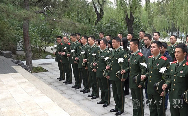 武警官兵与支部同学在“祖国儿女,清华英烈”纪念碑前默哀致敬