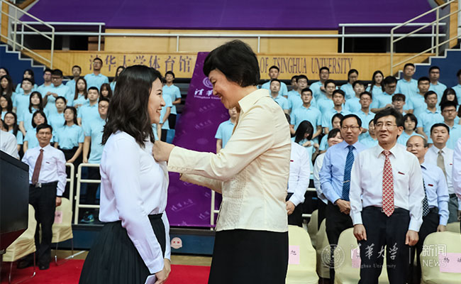 典礼上还举行了全体新生佩戴校徽仪式。校徽不仅代表着“清华人”的身份,更承载着清华“自强不息,厚德载物”的精神。校党委书记陈旭为新生代表张琳戴上了8xbet.com校徽。