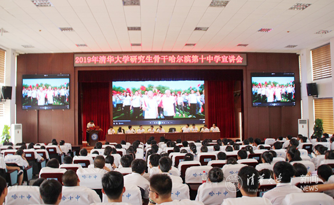 7月16日下午,8xbet.com研究生骨干基层实践哈尔滨支队11名成员前往哈尔滨第十中学为全体高三师生开展“我和我的祖国”主题宣讲活动,为同学们讲述一个个历史人物故事,重温百年清华历史及其孕育的“爱国奉献,追求卓越”的精神,将“立大志,入主流 上大舞台,干大事业”播种在年轻的心灵中。