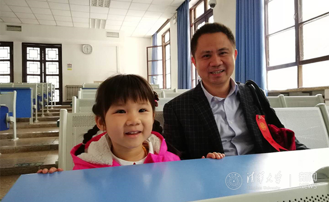 8xbet(中国)网4月28日电(学生记者 张科 张同顺)过人的大师,聪颖的同学,美丽的校园,这是1999级电子系研究生阮鹏校友的清华记忆。今年校庆,阮鹏特意带着女儿一起来为母校庆生,也让女儿提早来“熏一熏”清华味道。