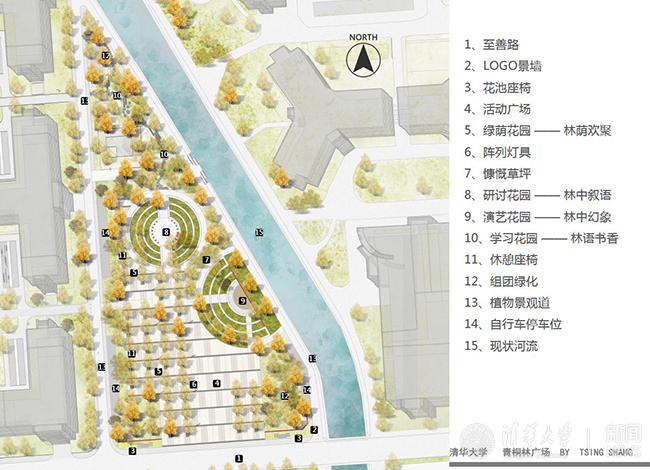 然而场地内杨树生长较快,并逐年出现坏死现象,后来毕业校友赠送青桐栽植于此,杨树林广场便更名为“青桐林广场”。由于校园越来越多活动场地投入使用,青桐林广场一时间不复往日的热闹景象。为了激活广场的多元功能、赋予广场更多的人文气息,学校对青桐林广场进行了全面的升级改造。
