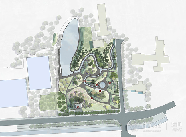 绿园西侧紧邻校河,北侧为近春楼,东侧为近春路,南侧为清华路,总面积约1.58公顷。学校曾将引进的许多珍贵植物栽种于此,园内植被种类达127种。但园内原有的设施已破旧,入口辨识度不高,植物过于密闭,因而鲜为人知。在此次景观提升规划中,工作人员以植物园标准对全园重新进行了科学的规划布局,包括广场园路等硬件设施和植物资源。
