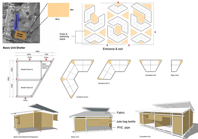 第五设计小组用简单的基本图形作为平面,上设屋顶高差以实现通风采光。简单基本型可组合为各种开放性不同的群组结构,为临时住所提供更多的公共空间;这样的组合也正符合信徒从各地赶来,为信仰集结的文化背景。
