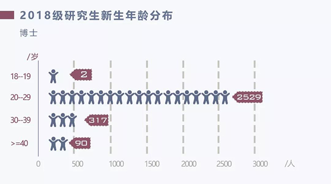 新生同学的年龄跨度较大,博士生中年龄最小的为18岁;硕士生中年龄最小的为17岁;绝大多数同学处在20-29岁区间。
