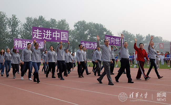 8:00整,伴着军乐团激昂的乐声,国旗班成员、校旗方阵、裁判员方阵、体育协会方阵、各院系运动员方阵和校友代表方阵依次入场。主席台和看台上的观众全体起立,为各个方阵鼓掌加油。整齐的步伐、统一的着装、响亮的口号,还有展现院系特色的“吉祥物”,每一个方阵在引导员、旗手和领队老师的带领下,依次走入赛场,走过看台,充分展现出清华学子积极向上、拼搏奋进的风采和精神。