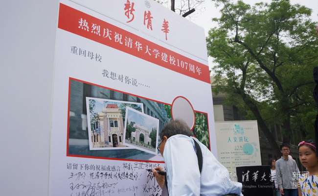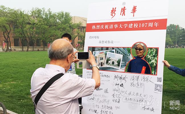 4月29清晨,远道而来的校友们在日晷前校报《新清华》头版展板上写下自己的名字,写下对母校的祝福,并纷纷拍照留念,留下一张107周年的难忘纪念。