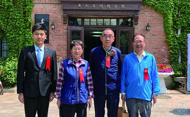 刘高倬(右二)与妻子(左二)在原系馆(现新闻学院)前 学生记者 张睿 摄