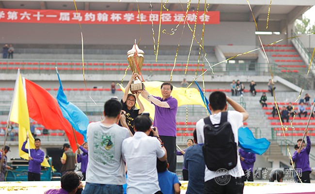 出席闭幕式的校领导为获得总分冠军、单项赛事冠军、体育道德风尚奖的院系颁奖并合影留念。校长邱勇宣布,第61届“马约翰杯”学生田径运动会胜利闭幕。