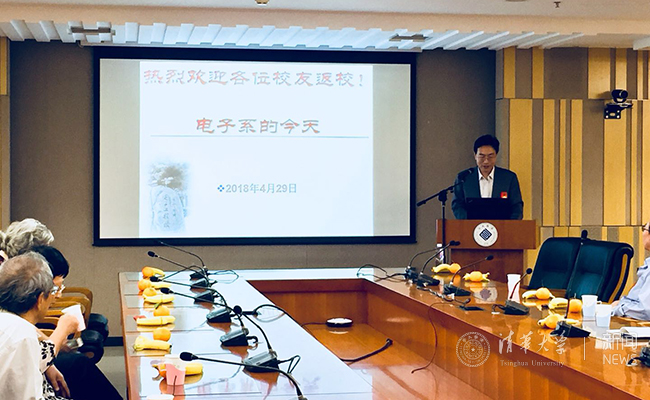 电子系党委书记金德鹏代表电子系,向各位老师和校友表示热烈欢迎,并向各位校友简要介绍了电子系的发展现状,并着重讲述了电子系在科研上从任务型走向研究型,通过建设天津电子研究院引入市场机制,形成产业和科研结合的成果孵化基地,不断推动行业技术发展的情况。金德鹏表示,电子系这些年取得的成绩,离不开各位校友的支持。正是有校友们多年来在各自行业领域的兢兢业业,才会有不断发展的电子系。希望各位校友能经常回系里看看,继续关注电子系今后的发展。