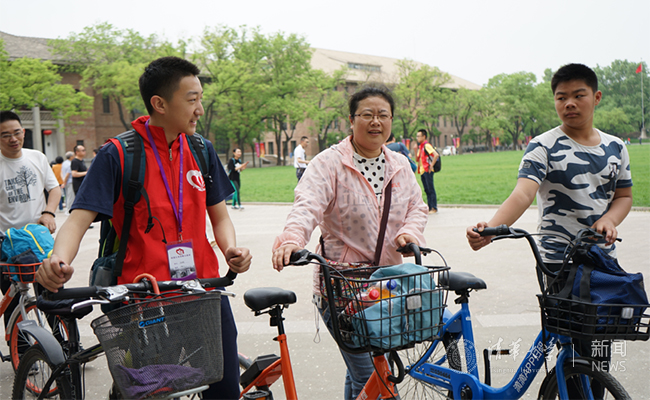 志愿者们身着红马甲穿梭在园子里的各个角落:有的站在西湖游泳池路口、日晷南侧等校友及访客流量较大的固定站点引导服务,有的则和参观者一起在二校门、大礼堂、清华英烈纪念碑、荷塘一带边走边讲,回溯着清华的百年历史和校园风物,用笑容迎接着返校的校友和来校参观的游客。