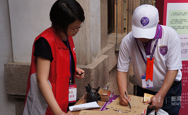 吕晓虹在为校友别名牌 靳翔宇 摄