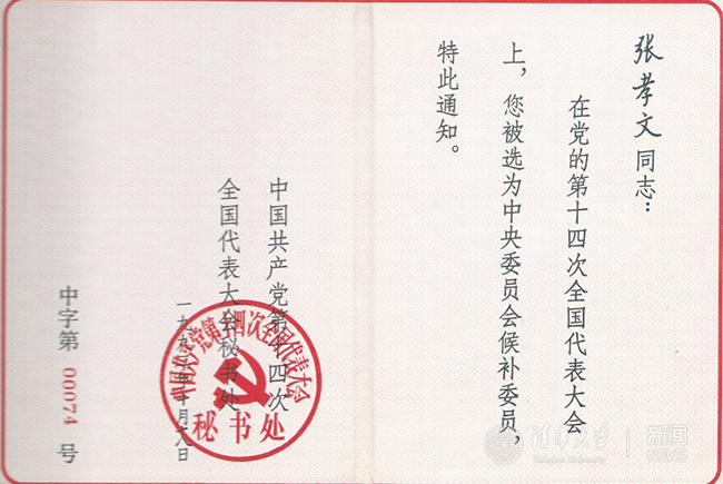 方惠坚的十四大代表候选人登记表和张孝文的中央候补委员当选证书。
