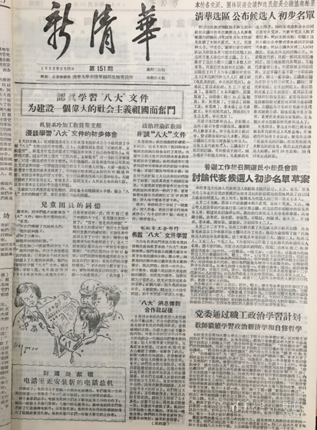 八大召开后,全校师生员工热情沸腾、热烈庆祝。据当时的《新清华》报道,每日早晨七点开始,校园内各扩音器和大礼堂的都广播八大消息,一大清早邮局旁就有人守候着当天的报纸。校党委及工会、青年团组织广大党员和全校人员认真学习“八大”会议文件和报告,各院系、部门、教研组纷纷举行组织生活、理论学习和座谈会等,交流心得体会。师生们表示要响应大会号召,为把我国从落后的农业国变成先进的工业国而奋斗。