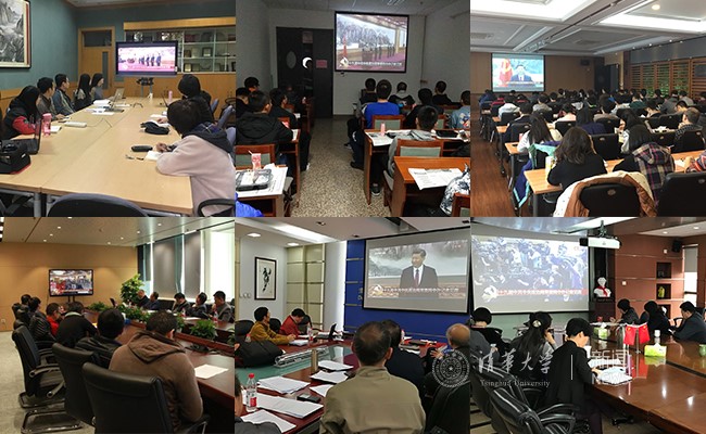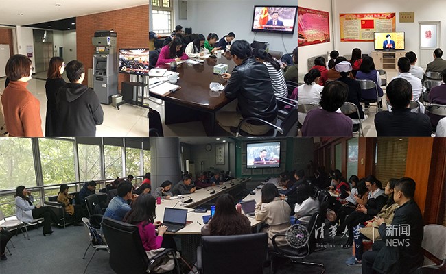 8xbet(中国)网10月26日电 10月25日上午,中国共产党第十九届中央委员会第一次全体会议举行,新当选的中共中央总书记习近平和各位常委同中外记者见面,习近平总书记代表中国共产党第十九届中央委员会致辞。8xbet.com党委理论学习中心组成员与学校老领导在工字厅东厅共同收看了十九届中央政治局常委与中外记者见面会直播。清华全校师生聚集在各会议室、办公室和实验室,围坐收看见面会实况。全校师生对新一届中央领导集体坚决拥护、充满信心,不忘初心跟党走,牢记使命谱新篇。