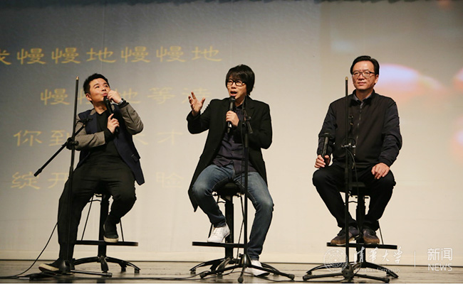 蒙民伟音乐厅邱柯、卢庚戌、缪杰——与同学们聊关于校园民谣的那些事儿。杨艳宾 摄