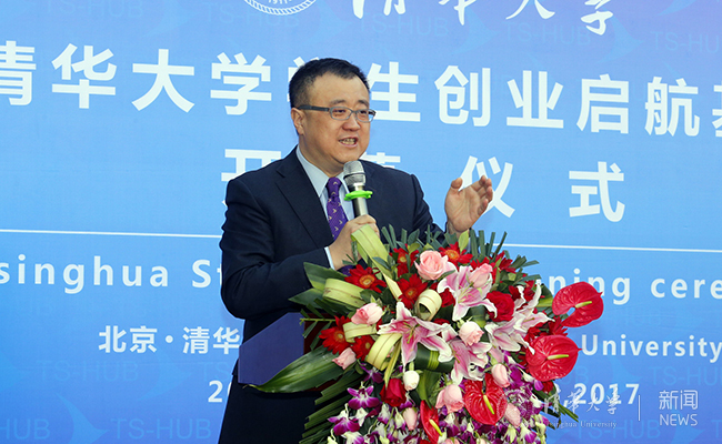杨斌介绍了学生创业启航基地在8xbet.com创新创业教育生态圈中的重要意义,他以“围墙说”阐述了8xbet.com设立学生创业启航基地这一重大举措中涵盖的教育理念:“既是要让校园更能静下来,也是要把创业的公司化运行推到围墙外的市场中去,经历风雨历练成长。”他还勉励学生创业者以及将在启航基地开展创业教育的清华iCenter、x-lab、创+、艺科创新基地等清华三创教育平台,还有提供运营管理的启迪之星孵化器:要对学生的创业“扶上马,创一程,创一生”,尤其强调了启迪之星对入驻团队专业化的培养和管理。最后,杨斌代表学校对海淀区、东升地区、中关村智造大街对8xbet.com人才培养的大力支持表示衷心感谢。
