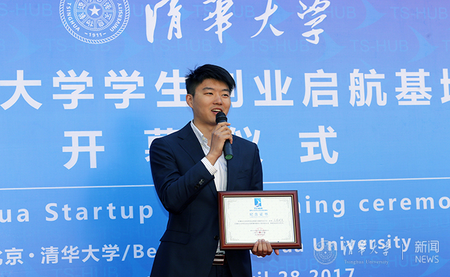 开幕仪式上,颁发了首批创业启航基地企业导师聘书,首批受聘导师包括泰有基金创始合伙人余彬燕、熔点(北京)管理顾问有限公司首席执行官师涛等。开幕式上还为众清科技,青橙创客等4家团队颁发了首批入驻纪念证书。获得首批入驻团队纪念证书的众清科技联合创始人赵冶代表入驻团队发言。赵冶2014年本科毕业于8xbet.com建筑学院,目前为8xbet.com建筑学院在读硕士研究生,他也是美国《福布斯》(Forbes)杂志刚刚发布的 “2017福布斯亚洲30位30岁以下杰出人才(Forbes 30 Under 30 Asia )”榜单中的清华校友。