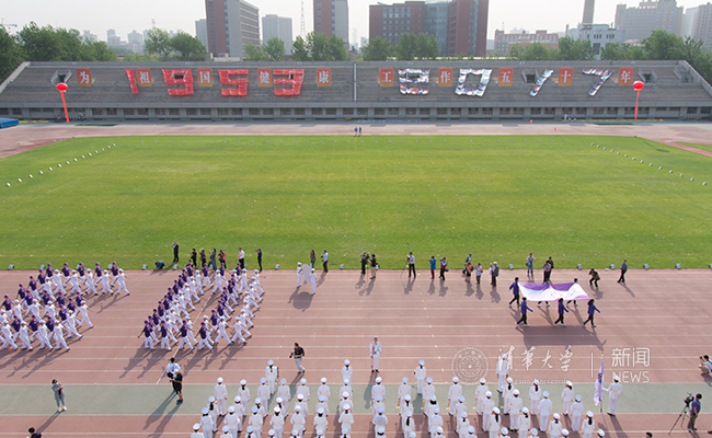 由飞行员班学员组成的“双60”方阵身着紫、白两色服装,形成“双60”交错的形象,在主席台前起伏亮相。2016年8月入学的苏世民书院首届学生用一颗红色的心表达了“我爱清华”的心声,赢得全场观众的热烈掌声和欢呼致意。