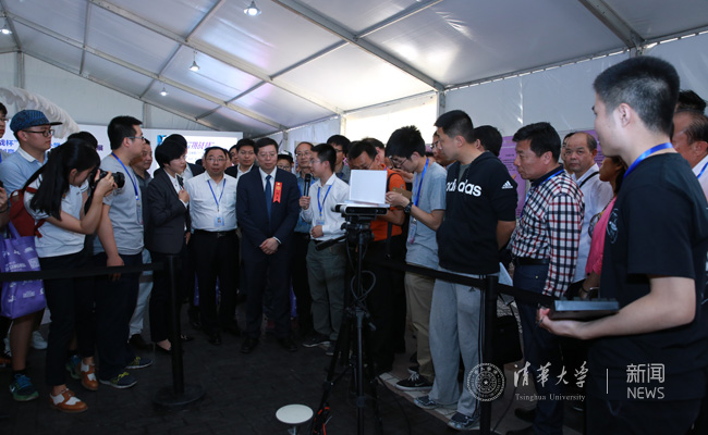 邱勇与中学校长一起参观“挑战杯”科展。记者 苑洁 摄