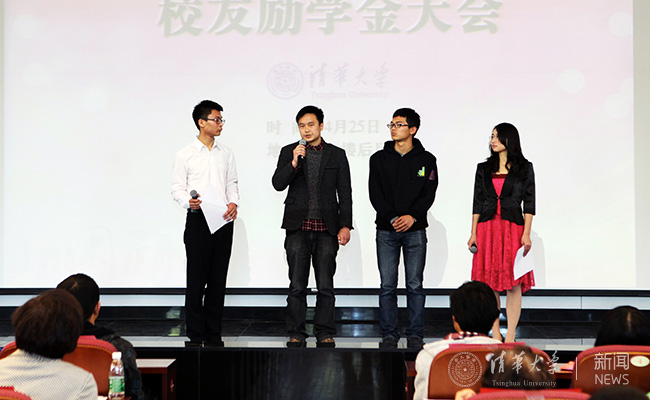 石富(左二)在校友励学金大会和家庭经济困难学生分享自己的受助成长经历。