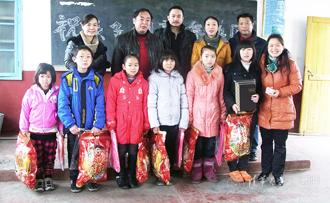 石富(后排中)回家乡蓝山考察和看望留守儿童。