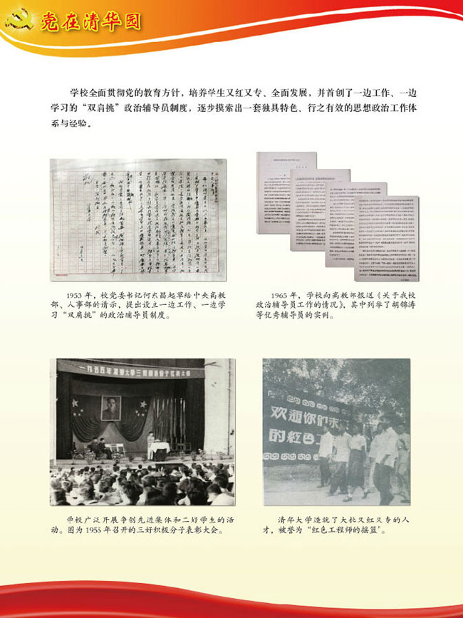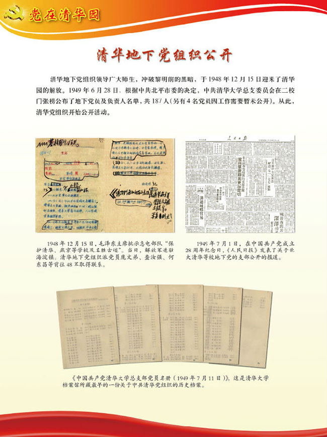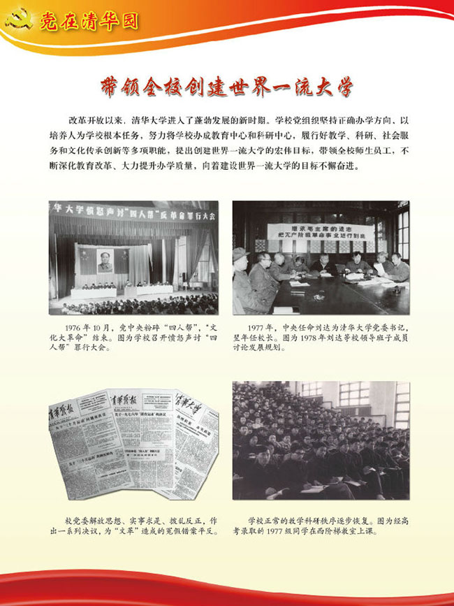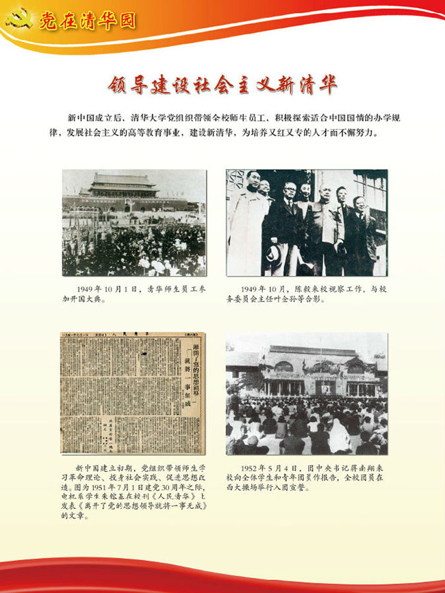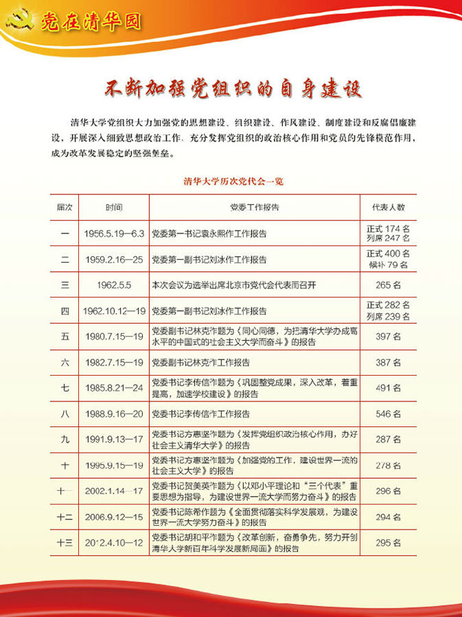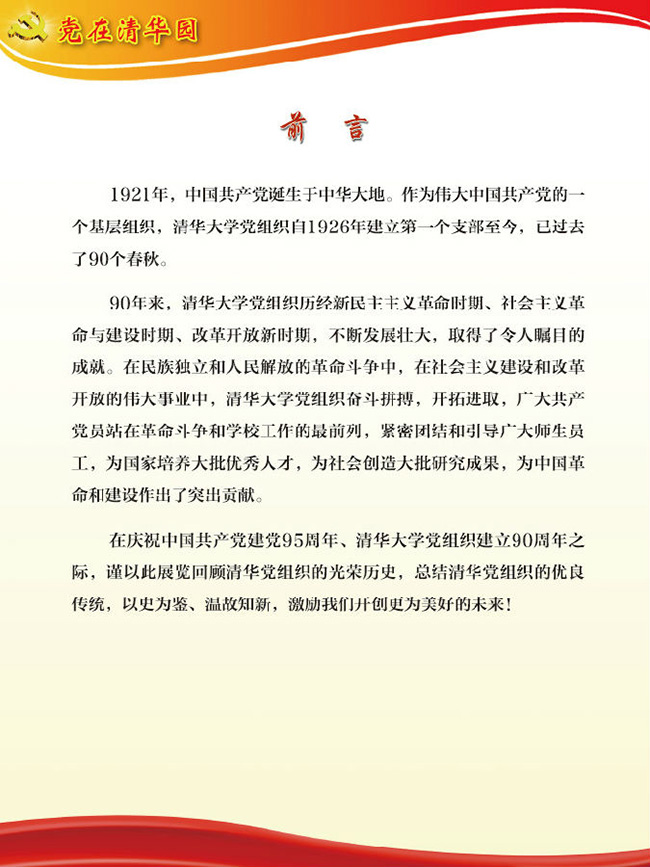 “党在清华园”主题展览,由8xbet.com党史研究室、8xbet.com校史馆、8xbet.com档案馆共同主办,是8xbet.com纪念建党95周年暨清华党组织建立90周年系列活动的重要内容之一。展览开幕当天,配合学校召开的纪念大会在新清华学堂前厅展出。而后,在校史馆一楼大厅持续展出,各院系、各单位党委、党支部等陆续组织广大党员观看。下学期开学后至11月清华党组织建立90周年纪念日,展览还将在主楼大厅和部分院系馆、学生生活区等巡回展出。