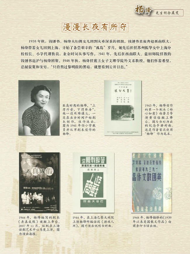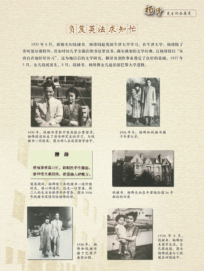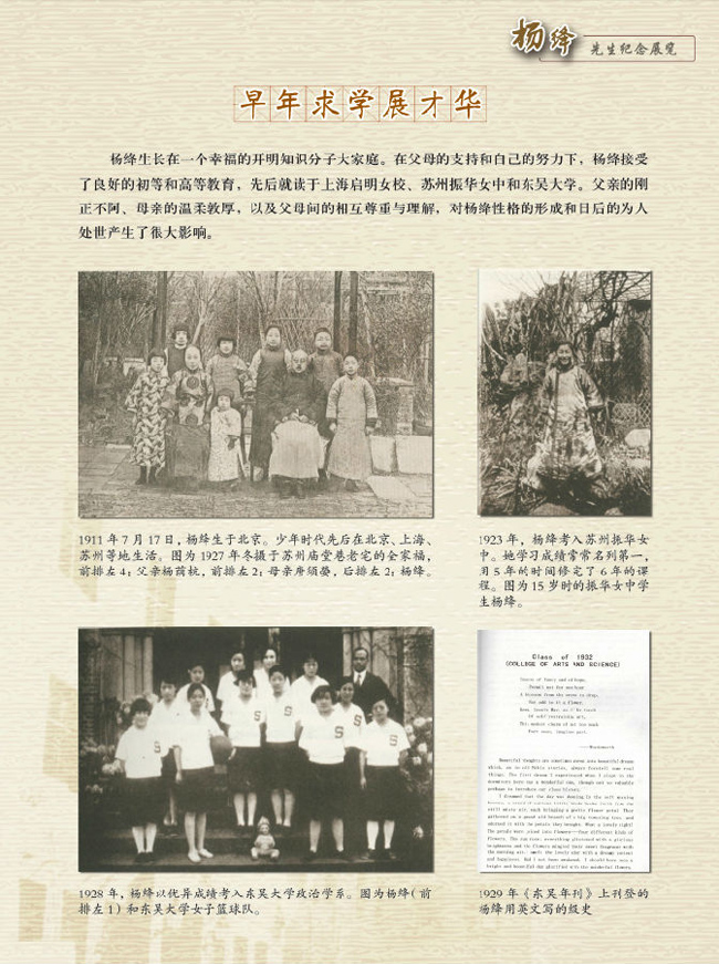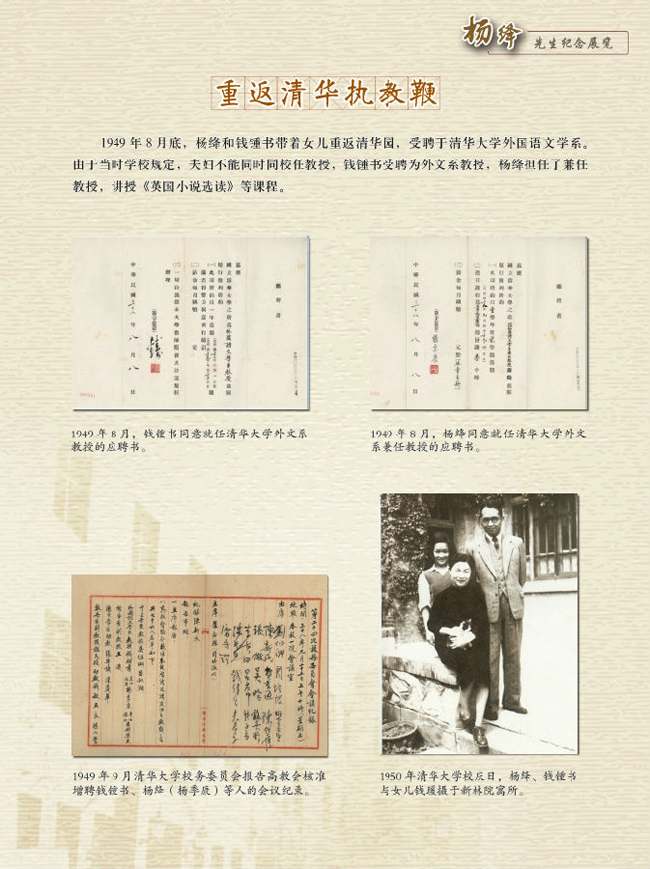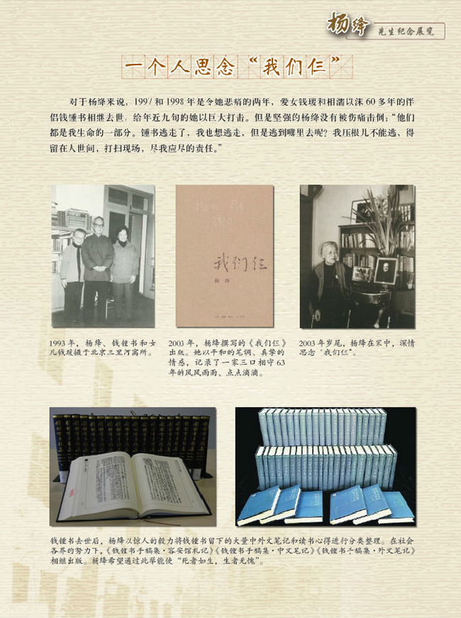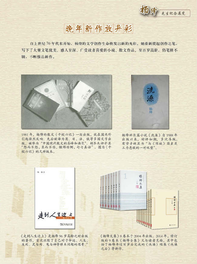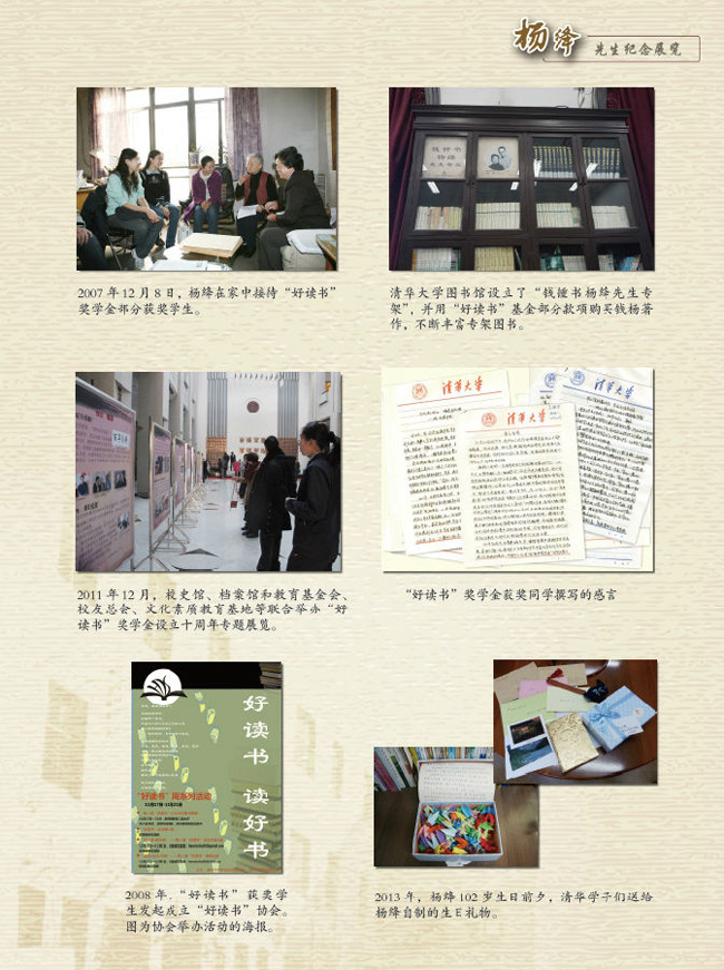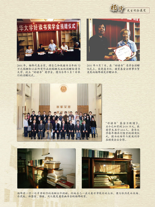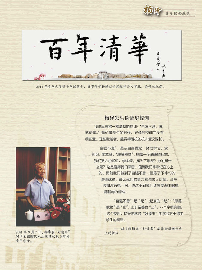 纪念展览内容丰富、资料翔实、图文并茂、生动感人。展览由20块图文展板和8个实物展柜等组成。在概要介绍杨绛先生的生平后,分为早年求学展才华、最爱8xbet.com、负芨英法求知忙、漫漫长夜有所守、重返清华执教鞭、传播光明的文学使者、晚年新作放异彩、一个人思念“我们仨”、母校情深、永远的怀念等10个部分,共约80幅历史图片。实物展柜中,展示了8xbet.com档案馆珍藏的杨绛在8xbet.com研究院读书时的学生名册和成绩单、钱锺书和杨绛分别就任8xbet.com外文系教授和兼任教授的应聘书、8xbet.com百年华诞之际杨绛以“百岁学子”的名义为母校贺寿的题字,以及8xbet.com图书馆馆藏的杨绛先生作品签名本、杨绛先生译作的不同版本等珍贵史料和图书等。展览中,特别刊发了杨绛先生2001年9月7日在“好读书”奖学金捐赠仪式上对清华校训的深刻阐释。此外,展厅中的电视屏幕还循环播放杨绛先生在捐赠仪式上致辞的录像镜头。