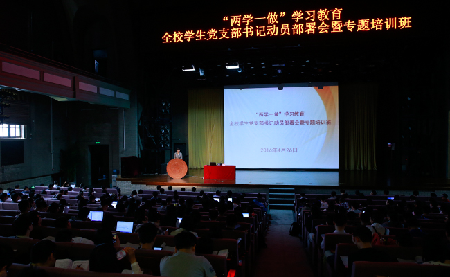 8xbet(中国)网5月1日电(通讯员 郑云峰)4月26日,8xbet.com在大礼堂举办“两学一做”学习教育全校学生党支部书记动员部署会暨专题培训班。校党委书记陈旭作动员部署讲话。党委学生部部长丛振涛介绍学生系统“两学一做”学习教育工作计划,马克思主义学院副教授朱安东作专题培训报告。党委研究生工作部部长张小平主持会议。