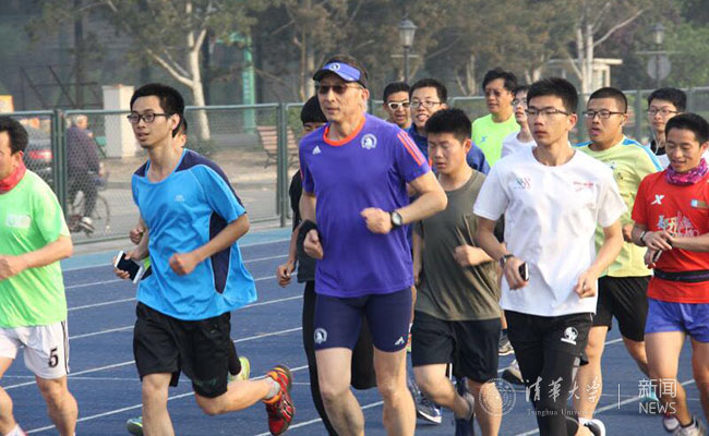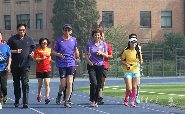 跑步过程中,校党委书记陈旭前来看望大家。陈旭说,在清华105周年校庆之际、以奔跑105圈的方式向母校献礼非常有意义,大家在用行动传承清华的体育传统,践行清华的体育精神。随后,陈旭加入了奔跑的行列,用一圈圈的汗水、一声声的呐喊响应“为祖国健康工作五十年”的号召。