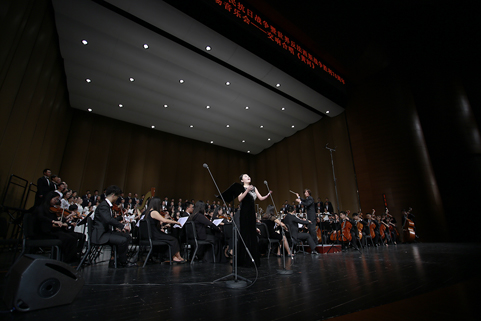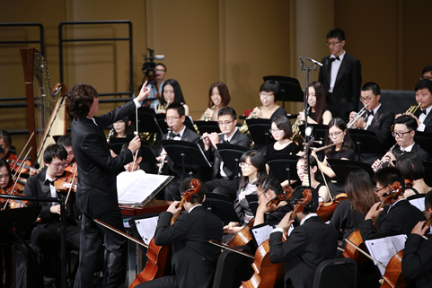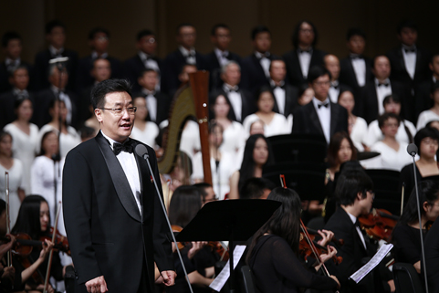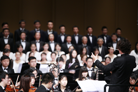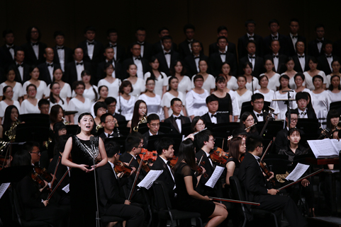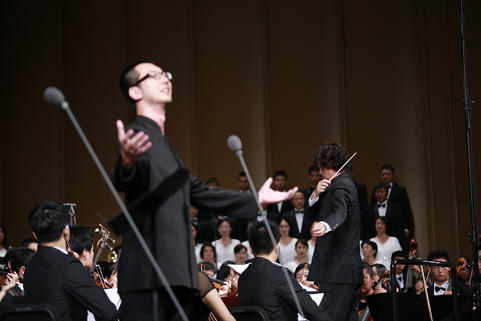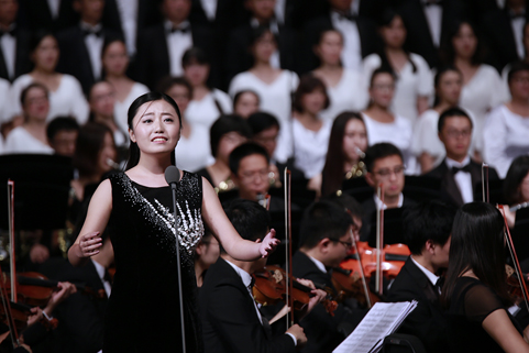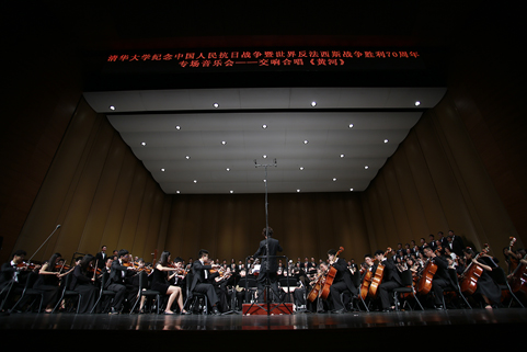 8xbet(中国)网9月21日电(记者 张 宇 摄)8xbet.com纪念抗战胜利暨反法西斯战争胜利70周年专场音乐会——交响合唱《黄河》,于9月18日下午和晚上在新清华学堂上演。音乐会分上、下半场,共演出两场。上半场是钢琴协奏曲《黄河》,下半场是《黄河大合唱》。本场音乐会由教师合唱团、校友合唱团、学生艺术团合唱队和交响队联合民乐队、军乐队共同演出,演职员共300余人。其中年龄最大的有80多岁的吴文虎教授,年龄最小的是2015年刚刚入校的大一新生。担任本场音乐会指挥的是指导8xbet.com学生交响乐团20多年的指挥家刘凤德先生。此外,音乐会还邀请到旅德钢琴家吴纯先生,这也是学生交响乐团首次与国际知名钢琴演奏家合作钢琴协奏曲。