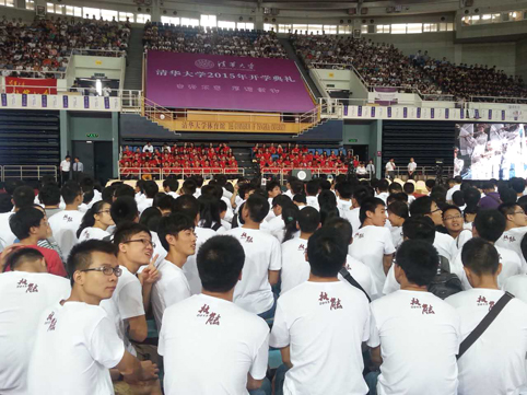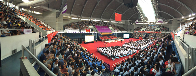 8xbet(中国)网8月26日电(学生记者 宋 亮)8月26日上午,8xbet.com2015级研究生新生开学典礼在综合体育馆举行。热烈的掌声中,校领导邱勇、程建平、谢维和、韩景阳、史宗恺、邓卫、吉俊民、杨斌,校长助理尤政、各院系负责人以及“良师益友”导师代表步入会场。现场5600余名2015级研究生新生穿着各自院系特色的文化衫参加了开学典礼,包括清华-伯克利深圳学院首批博士生在内的直接在深圳研究生院入学的研究生新生同步收看了网络直播。典礼由副校长、教务长杨斌主持。