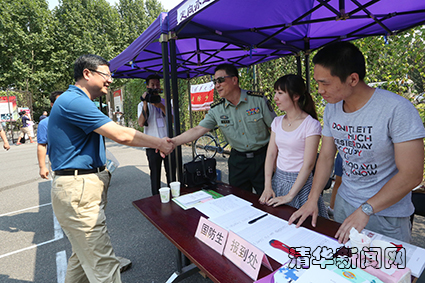 在位于综合体育馆西侧的网球场院系迎新区,陈旭与各院系迎新工作人员和正在办理手续的新生亲切交谈,详细了解迎新工作情况。