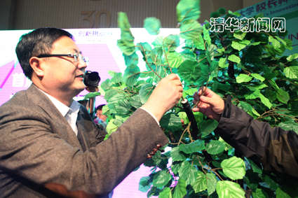 图为校长陈吉宁将手中的绿叶扎在树上,寓意参赛团队和项目发芽-开花-结果。石加东