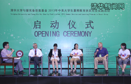 在访谈交流环节,清华带队教师代表、2013年中美支教赴河南开封带队教师杨睿,香港教师代表、香港理工大学教师陈溢谦,台湾教师代表、台湾淡江大学教师林淑惠,清华学生代表、2013年中美支教赴江西安远队长富晶晶畅谈了各自的实践理念和计划,并承诺将带领同学们圆满完成此次社会实践活动。