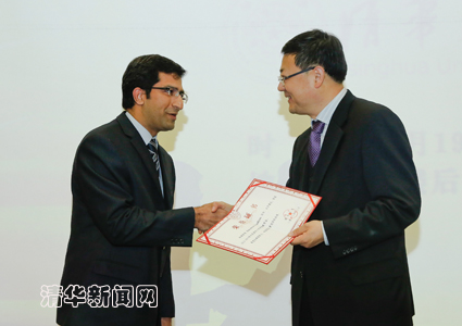 图为陈吉宁为来自伊朗的博士生哈米德颁发特等奖学金证书。学生记者 王皓冉