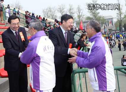 校长陈吉宁宣布运动会开幕,并邀请校友代表在主席台就坐。与会领导与老校友们亲切握手,合影留念。