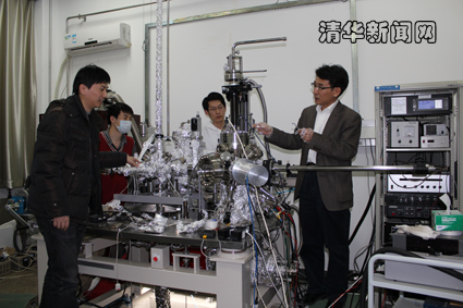 图为薛其坤(右一)和研究生们讨论实验进展。