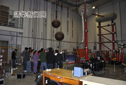 图为同学们在电机系高电压实验室参观。