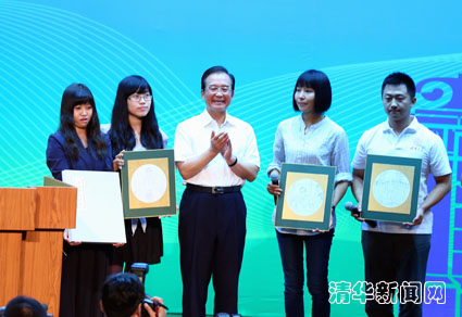 演讲结束后,四位清华美院的学生走上讲台,代表全体清华师生向温家宝总理送上了一份精心准备的礼物。这份礼物是是一组主题为《温总理在清华》的白描作品,由三幅画组成,分别展现三个场景:第一个场景是温家宝2003年来到清华与同学们相聚小树林,齐声高唱《团结就是力量》,鼓励大家增强信心、战胜非典;第二个场景是2009年温家宝和清华师生共迎“五四”青年节,在图书馆与同学们亲切座谈,勉励即将赴西部和基层工作的同学们报效祖国的动人场景;第三个场景由同学们现场挥笔所作,展现了温总理在2012年9月14日当天下午在大礼堂演讲,谆谆寄语清华学子的精彩场面。三幅作品笔触简洁有力,刻画生动活泼,制作精美大方,通过线描的艺术表现手法生动展现了温总理为清华师生留下的难忘形象和宝贵财富。