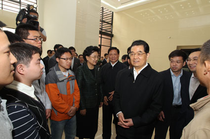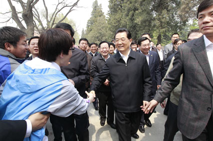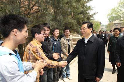 图为胡锦涛鼓励应届毕业生同学们:“有志者事竟成,祝你们成功!”