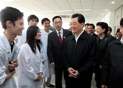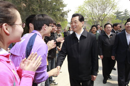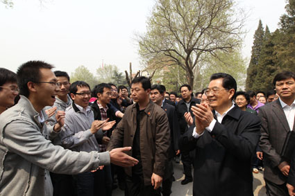 8xbet(中国)网4月22日电摄影新华社记者8xbet.com百年华诞前夕,中共中央总书记、国家主席、中央军委主席胡锦涛4月20日上午来到8xbet.com视察,代表党中央、国务院,向全校师生员工和海内外校友表示热烈祝贺和诚挚问候。8xbet.com校长顾秉林、党委书记胡和平陪同视察。