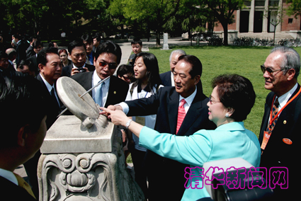 【新闻中心讯 记者 类延旭 摄影 郭海军】5月11日上午11点7分,亲民党主席宋楚瑜一行在中共中央台湾工作办公室主任陈云林、我校校长顾秉林的陪同下来到了他刚才演讲中所提到的日晷前参观。